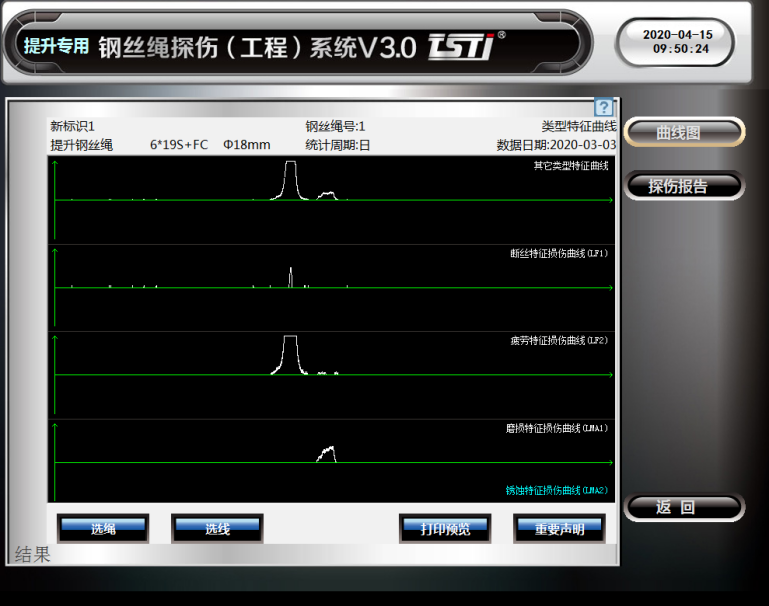 TST鋼絲繩探傷(工程)系統是一種針對各種工況提升鋼絲繩的損傷現象實時在線無損探傷的工程設備系統。該系統以“KJ578煤礦用鋼絲繩探傷系統”為硬件平臺,搭載“TST鋼絲繩探傷(工程)系統V4.0”專業分析軟件,采用“變量補償傳感器”、“三維磁感應橋”和“自平衡同步勵磁”等無損探傷專利技術綜合集成可全天候無人值守在線實時探測鋼絲繩內外部斷絲、銹蝕、疲勞、磨損及變形等各種損傷隱患,通過LMA曲線分析,評估鋼絲繩的使用壽命。